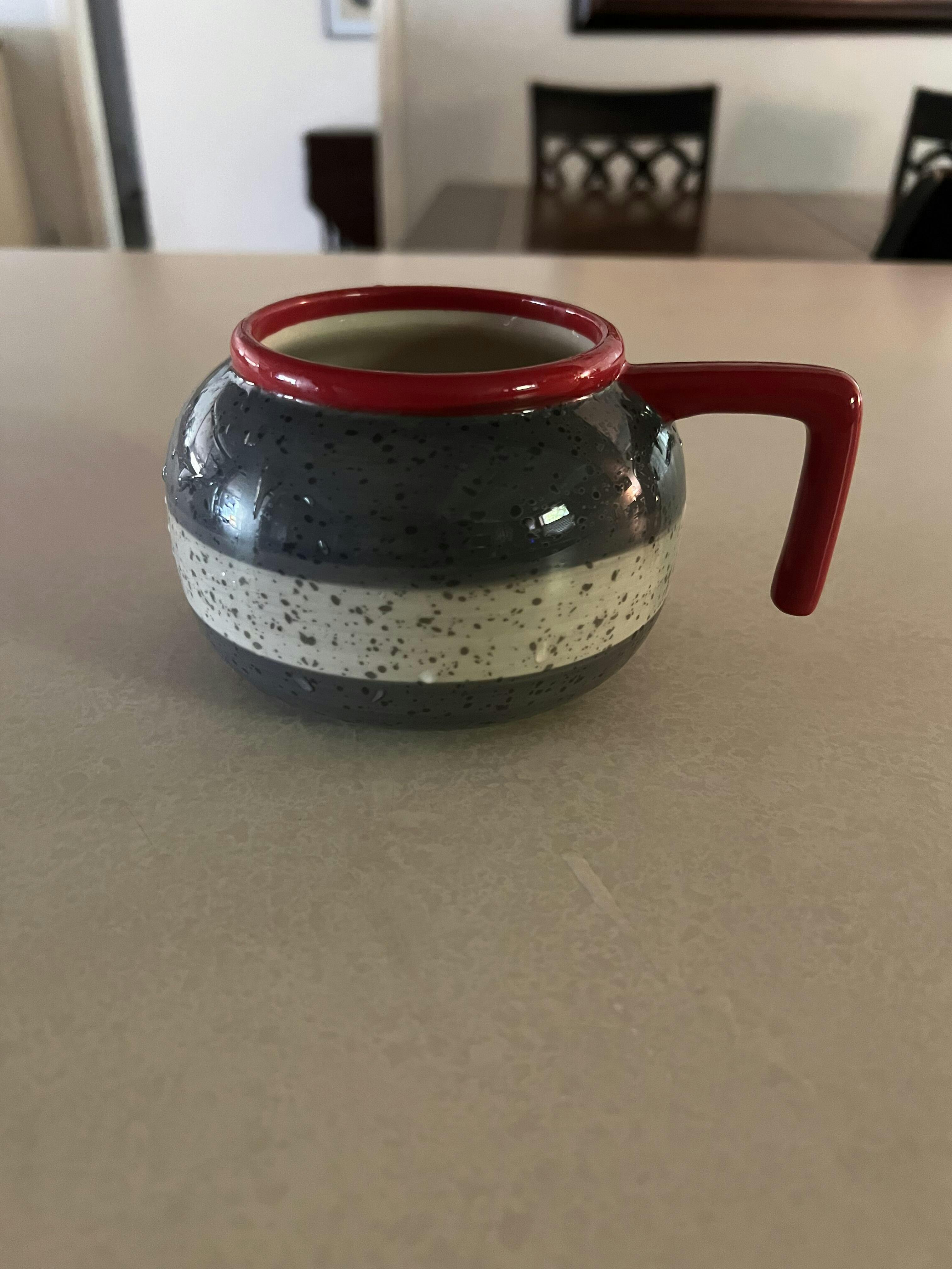 Add a unique spin to your coffee routine with this awesome Curling Rock Shaped Coffee Mug. This fun and functional mug features a distinctive curling rock design that is sure to spark conversations between curling lovers and coffee aficionados. Perfect for enjoying your favorite hot beverages like coffee, tea, or hot chocolate, the ergonomic handle ensures a comfortable grip, while the generous capacity is ideal for starting your day off right. Whether you are a curling enthusiast or just love quirky drinkware, this mug makes a great gift or addition to your collection. This Curling Rock Shaped Coffee Mug is brand new, never used and comes with the original box.